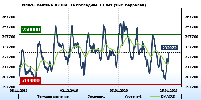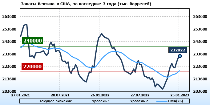 Коммерческие запасы нефти в США выросли на 0.533 до 448.548 млн. баррелей, при прогнозе +0.971 млн. баррелей. Запасы бензина выросли на 1.763 до 232.022 млн. баррелей. Запасы дистиллятов упали на -0.507 до 115.27 млн. баррелей. Запасы в хранилище Кушинг выросли на 4.267 до 35.694 млн. баррелей.