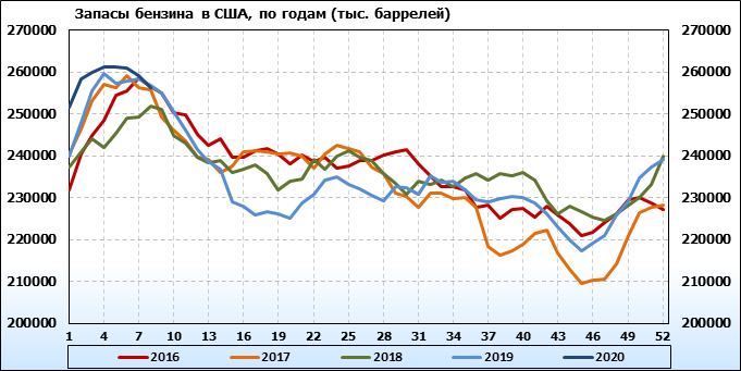 Спрос на бензин вырос на 0.117 до 9.035 млн. баррелей в день. Производство бензина выросло на 0.272 до 9.797 млн. баррелей в день. Импорт бензина упал на -0.016 до 0.405 млн. баррелей в день. Экспорт бензина вырос на 0.072 до 0.842 млн. баррелей в день.