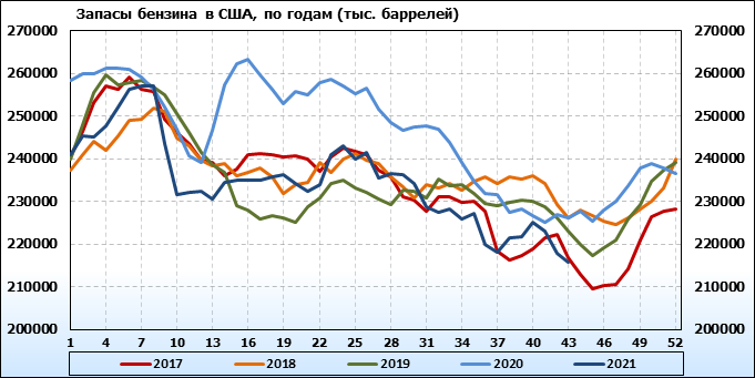 Коммерческие запасы нефти в США выросли на 4.268 до 430.812 млн. баррелей, при прогнозе +1.914 млн. баррелей. Запасы бензина упали на -1.993 до 215.746 млн. баррелей. Запасы дистиллятов упали на -0.432 до 124.962 млн. баррелей. Запасы в хранилище Кушинг упали на -3.899 до 27.332 млн. баррелей.