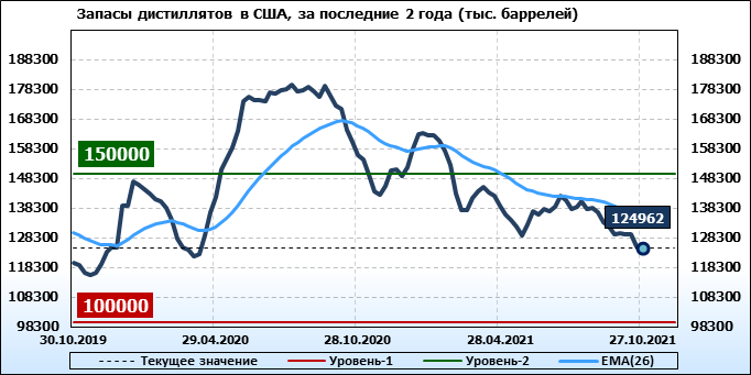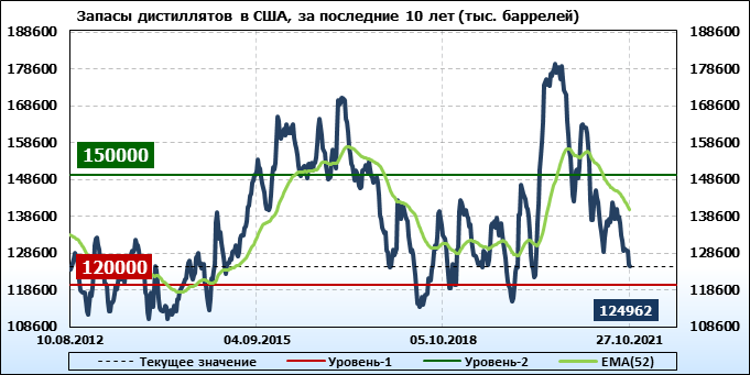 Спрос на дистилляты упал на -0.409 до 3.869 млн. баррелей. Производство дистиллятов выросло на 0.164 до 4.581 млн. баррелей. Импорт дистиллятов вырос на 0.123 до 0.325 млн. баррелей. Экспорт дистиллятов вырос на 0.199 до 1.099 млн. баррелей в день.