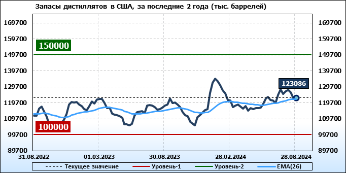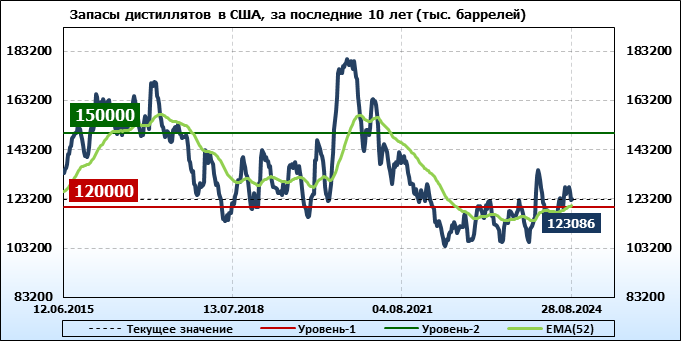 Спрос на дистилляты вырос на 0.246 до 3.822 млн. баррелей. Производство дистиллятов выросло на 0.11 до 5.002 млн. баррелей. Импорт дистиллятов вырос на 0.157 до 0.22 млн. баррелей. Экспорт дистиллятов упал на -0.492 до 1.361 млн. баррелей в день.