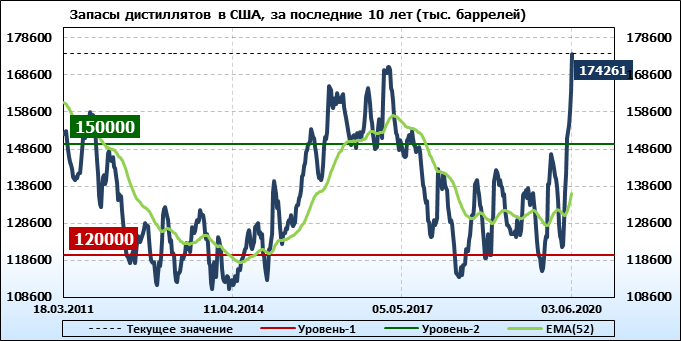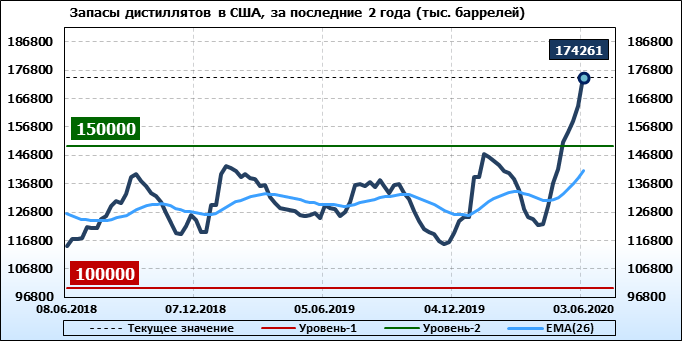 Коммерческие запасы дистиллятов поднялись на 9934 тыс. баррелей, достигнув 174,261 млн баррелей.