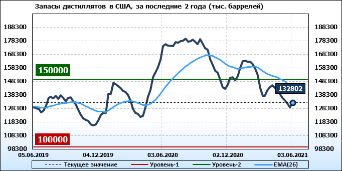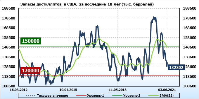 Коммерческие запасы дистиллятов поднялись на 3720 тыс. баррелей, достигнув 132,802 млн баррелей.
