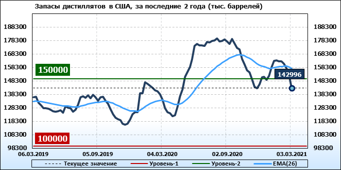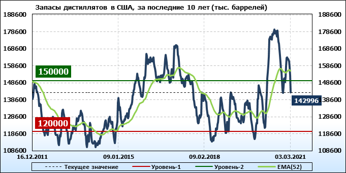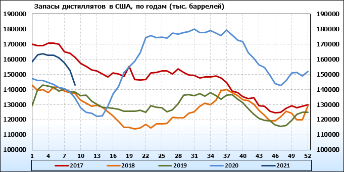 Коммерческие запасы дистиллятов снизились на 9719 тыс. баррелей, достигнув 142,996 млн баррелей.