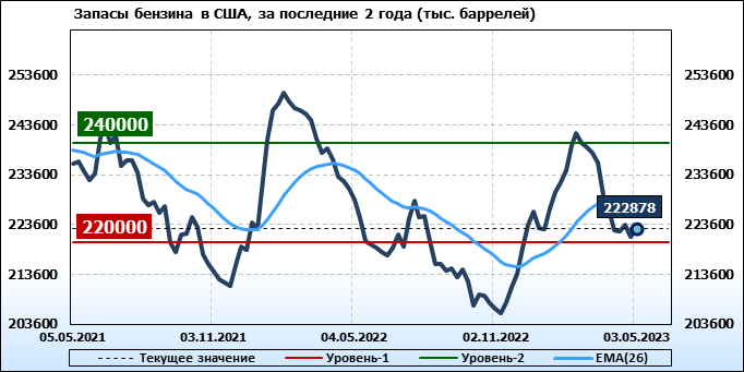 Коммерческие запасы нефти в США упали на -1.281 до 459.633 млн. баррелей, прогнозы -1.1 млн. баррелей. Запасы бензина выросли на 1.742 до 222.878 млн. баррелей. Запасы дистиллятов упали на -1.19 до 110.323 млн. баррелей. Запасы в хранилище Кушинг выросли на 0.541 до 33.61 млн. баррелей.