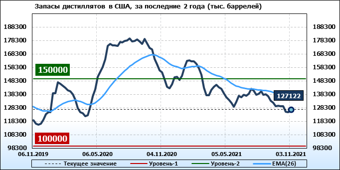 Спрос на дистилляты упал на -0.183 до 3.686 млн. баррелей. Производство дистиллятов выросло на 0.252 до 4.833 млн. баррелей. Импорт дистиллятов упал на -0.135 до 0.19 млн. баррелей. Экспорт дистиллятов упал на -0.071 до 1.028 млн. баррелей в день.