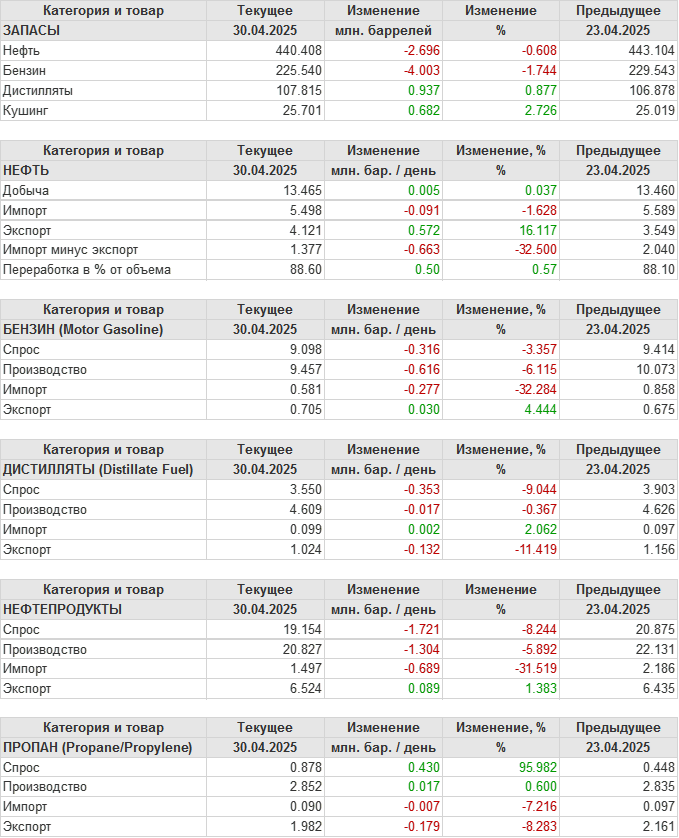 API. Изменение запасов нефти в США на 29 апреля 2025