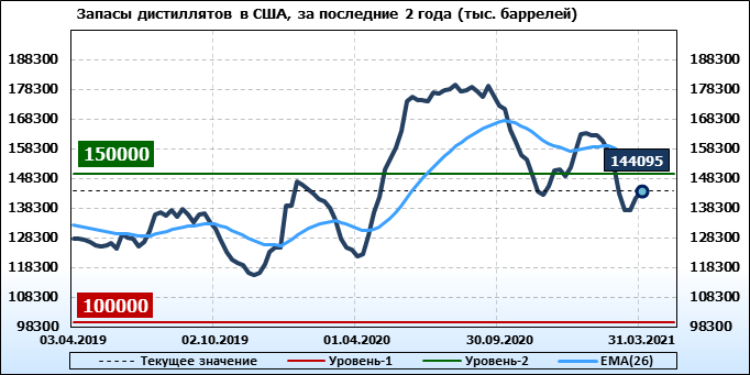 Спрос на дистилляты вырос на 0.521 до 4.113 млн. баррелей. Производство дистиллятов выросло на 0.137 до 4.738 млн. баррелей. Импорт дистиллятов упал на -0.223 до 0.441 млн. баррелей. Экспорт дистиллятов упал на -0.426 до 0.703 млн. баррелей в день.