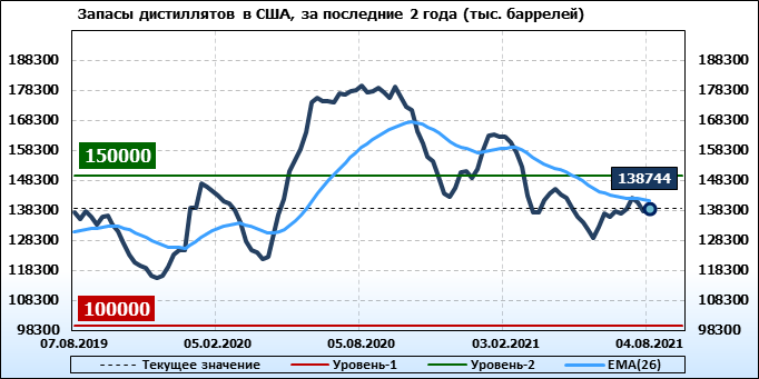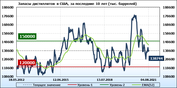 Спрос на дистилляты упал на -0.738 до 3.618 млн. баррелей. Производство дистиллятов выросло на 0.138 до 4.877 млн. баррелей. Импорт дистиллятов упал на -0.026 до 0.162 млн. баррелей. Экспорт дистиллятов вырос на 0.29 до 1.302 млн. баррелей в день.