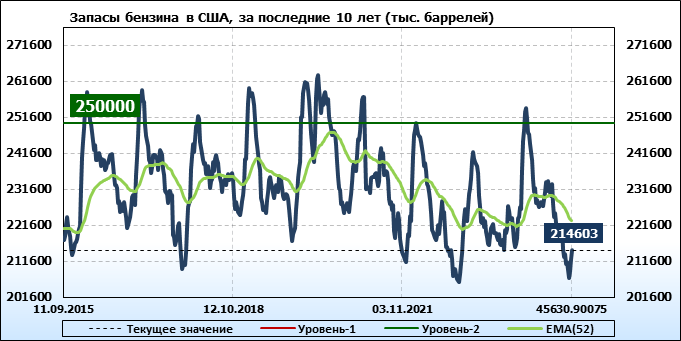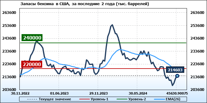 Спрос на бензин вырос на 0.232 до 8.738 млн. баррелей в день. Производство бензина упало на -0.248 до 9.496 млн. баррелей в день. Импорт бензина упал на -0.125 до 0.511 млн. баррелей в день. Экспорт бензина упал на -0.069 до 0.994 млн. баррелей в день.