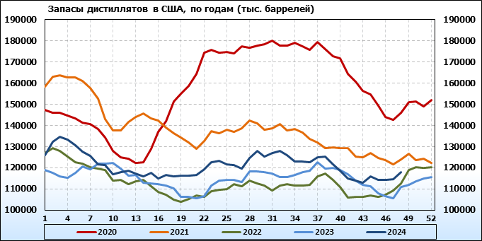 Спрос на дистилляты упал на -0.32 до 3.398 млн. баррелей. Производство дистиллятов выросло на 0.219 до 5.315 млн. баррелей. Импорт дистиллятов упал на -0.028 до 0.116 млн. баррелей. Экспорт дистиллятов вырос на 0.087 до 1.55 млн. баррелей в день.