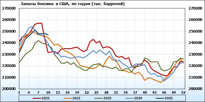 Коммерческие запасы нефти в США выросли на 3.614 до 433.775 млн. баррелей, при прогнозе +0.6 млн. баррелей. Запасы бензина упали на -1.433 до 246.838 млн. баррелей. Запасы дистиллятов упали на -1.318 до 119.154 млн. баррелей. Запасы в хранилище Кушинг выросли на 1.124 до 25.697 млн. баррелей.