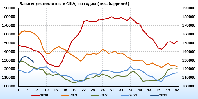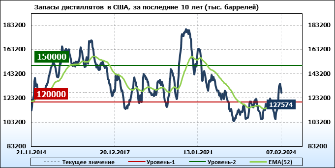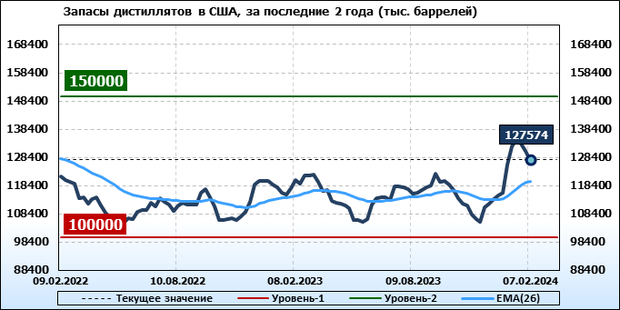 Спрос на дистилляты вырос на 0.06 до 3.817 млн. баррелей. Производство дистиллятов упало на -0.028 до 4.357 млн. баррелей. Импорт дистиллятов упал на -0.012 до 0.126 млн. баррелей. Экспорт дистиллятов упал на -0.003 до 1.126 млн. баррелей в день.