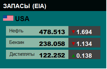 Коммерческие запасы нефти в США упали на -1.694 до 478.513 млн. баррелей, при прогнозе +0.395 млн. баррелей. Запасы бензина упали на -1.134 до 238.058 млн. баррелей. Запасы дистиллятов выросли на 0.138 до 122.252 млн. баррелей. Запасы в хранилище Кушинг упали на -0.89 до 39.828 млн. баррелей.