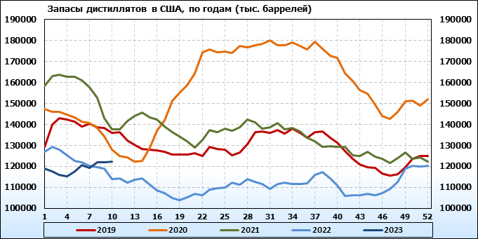 Спрос на дистилляты упал на -0.321 до 3.514 млн. баррелей. Производство дистиллятов упало на -0.084 до 4.525 млн. баррелей. Импорт дистиллятов упал на -0.056 до 0.141 млн. баррелей. Экспорт дистиллятов вырос на 0.187 до 1.132 млн. баррелей в день.