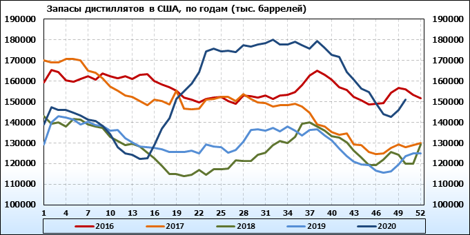 Коммерческие запасы дистиллятов поднялись на 5222 тыс. баррелей, достигнув 151,092 млн баррелей.