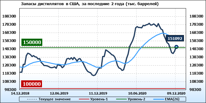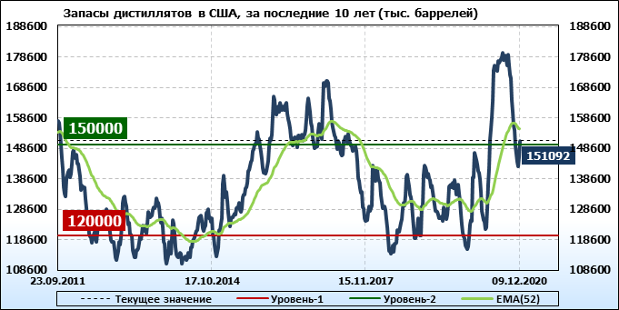 Коммерческие запасы дистиллятов поднялись на 5222 тыс. баррелей, достигнув 151,092 млн баррелей.