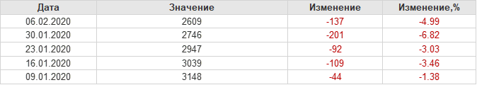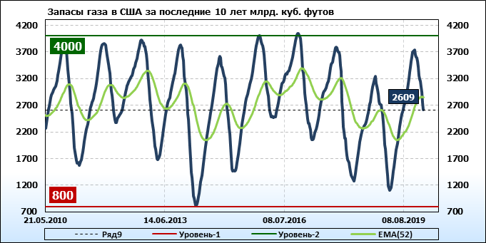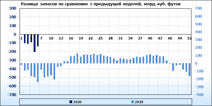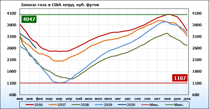 По сообщению статистической службы EIA от 06.02.2020 запасы газа в США на 30.01.2020 составили 2609 млрд. куб. футов. За неделю запасы природного газа в хранилищах упали на 137 млрд. куб. футов. По итогам недели падение запасов газа составило 4.99 процента.