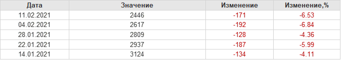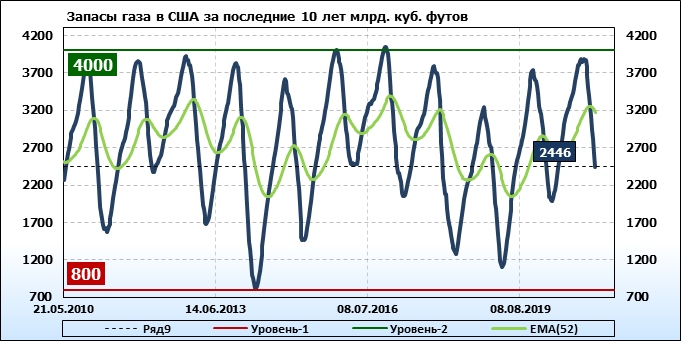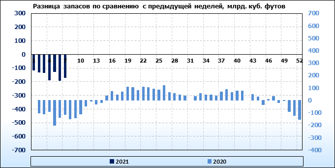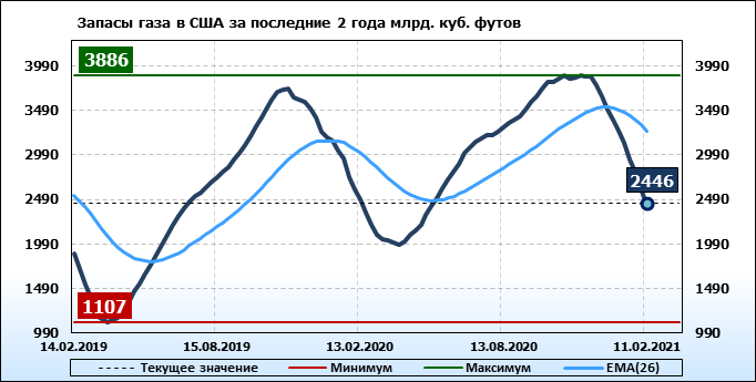 По сообщению статистической службы EIA от 11.02.2021 запасы газа в США на 04.02.2021 составили 2446 млрд. куб. футов. За неделю запасы природного газа в хранилищах упали на 171 млрд. куб. футов. По итогам недели падение запасов газа составило 6.53 процента.