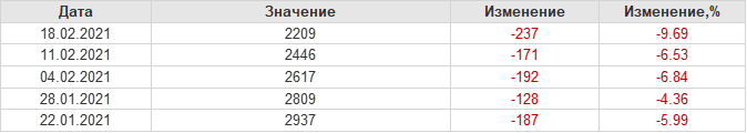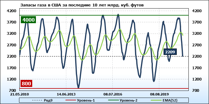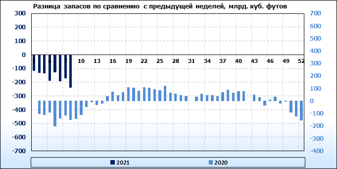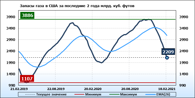 По сообщению статистической службы EIA от 18.02.2021 запасы газа в США на 11.02.2021 составили 2209 млрд. куб. футов. За неделю запасы природного газа в хранилищах упали на 237 млрд. куб. футов. По итогам недели падение запасов газа составило 9.69 процентов.