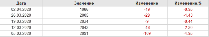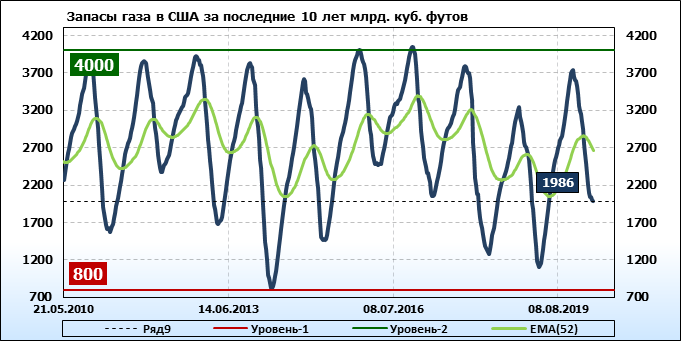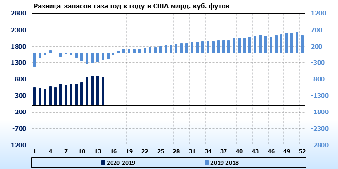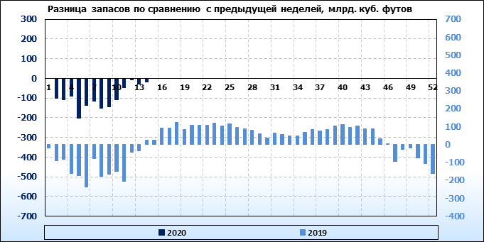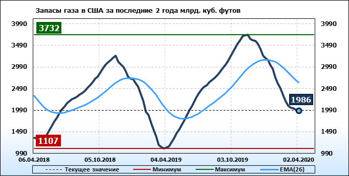 По сообщению статистической службы EIA от 02.04.2020 запасы газа в США на 26.03.2020 составили 1986 млрд. куб. футов. За неделю запасы природного газа в хранилищах упали на 19 млрд. куб. футов. По итогам недели падение запасов газа составило 0.95 процента.