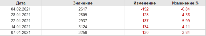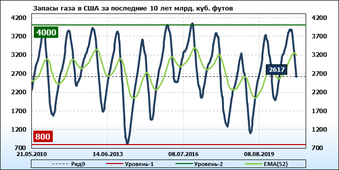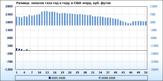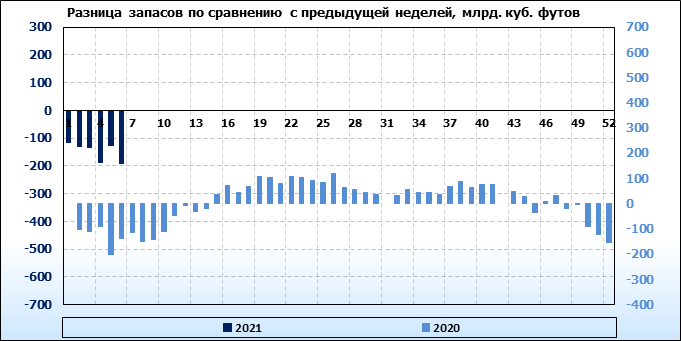 По сообщению статистической службы EIA от 04.02.2021 запасы газа в США на 28.01.2021 составили 2617 млрд. куб. футов. За неделю запасы природного газа в хранилищах упали на 192 млрд. куб. футов. По итогам недели падение запасов газа составило 6.84 процентов.
