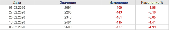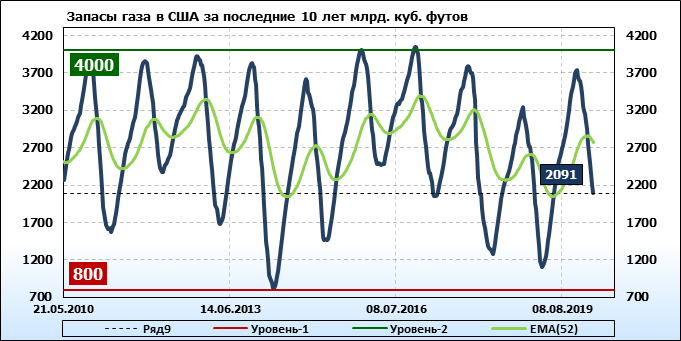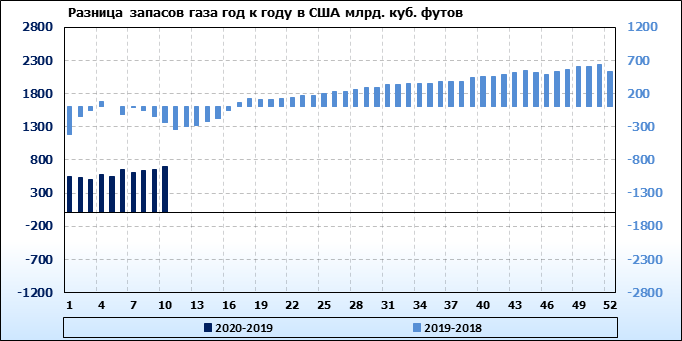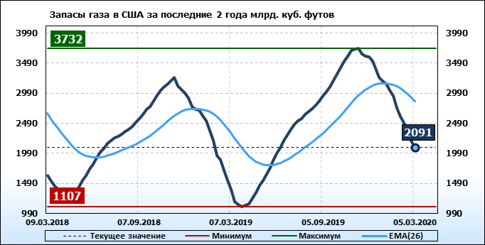 По сообщению статистической службы EIA от 05.03.2020 запасы газа в США на 27.02.2020 составили 2091 млрд. куб. футов. За неделю запасы природного газа в хранилищах упали на 109 млрд. куб. футов. По итогам недели падение запасов газа составило 4.95 процента.