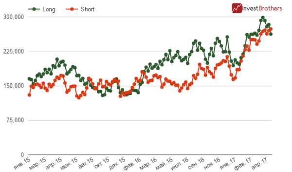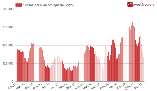 Длинные позиции росли куда более скромными темпами, за неделю прибавив лишь 6,5 тыс контрактов. Тем самым, вот уже четвертую неделю к ряду снижается общая ставка на рост нефти, ко Дню Победы она опустилась до 168,8 тыс. контрактов – самый скромный объем с середины ноября 2016 г. Тогда, кстати, все для сырья закончилось хорошо: ОПЕК заключила сделку по сокращению добычи и “черное золото” пошло к новым локальным максимумам.