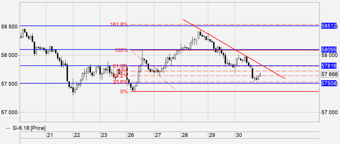 Продажа: возможна на малых интервалах. Пока рынок остается ниже 57800.