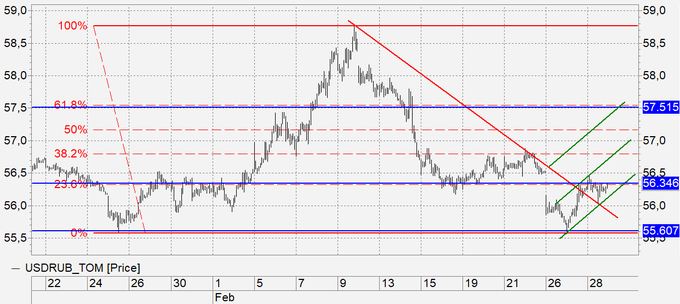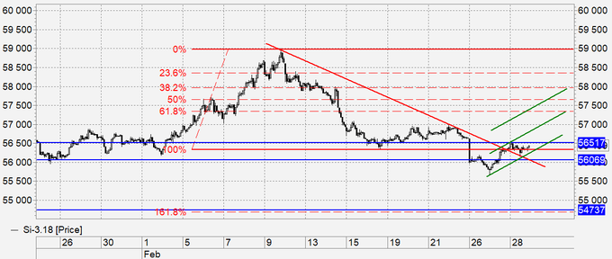 Наиболее вероятно: пока ниже 56.50 – падение, иначе рост.