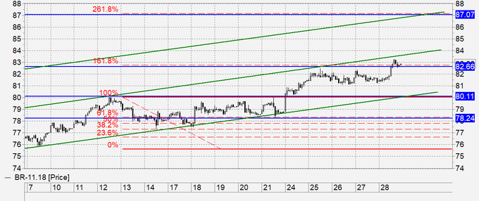 Нефть: продолжаем идти вверх. Ближайшие цели 85.00 и 90.00. В США начинается сезон ремонта нефтеперерабатывающих заводов. Поэтому, ждем отчетов, где будет отражаться рост запасов нефти, что не должно способствовать продолжению роста. С другой стороны, пока мир ждет официального ввода санкций против Ирана (4 ноября) и прогнозирует ужасы поставок, хотя реальной почвы для этого нет, так как экспорт из Ирана максимум упадет на 1 млн. баррелей, цены будут получать поддержку. Разум пока вряд ли победит, поэтому, мы скорее всего продолжим рост к 85.00.