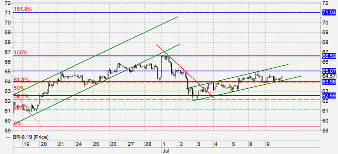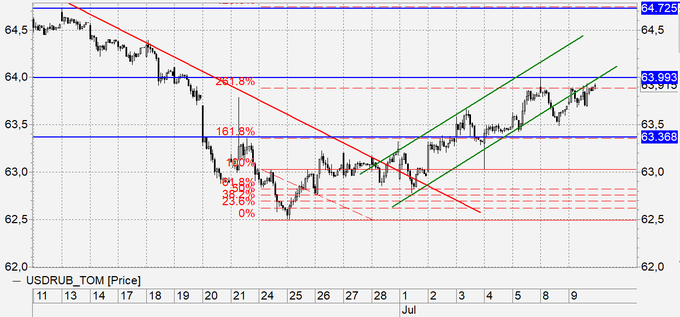 Рубль: пока не можем утверждать, что шансы на укрепление рубля иссякли. Несмотря на вчерашнее небольшое ослабление, уровень 64.00 так и не был взят. Ели нефть поможет, сможем удержаться на текущих значениях и развернуться вниз. Негатив для рубля пока не просматривается. Даже снижение ставки на 0,25% 26-го июля вряд ли вызовет сильные волнения на рынке.