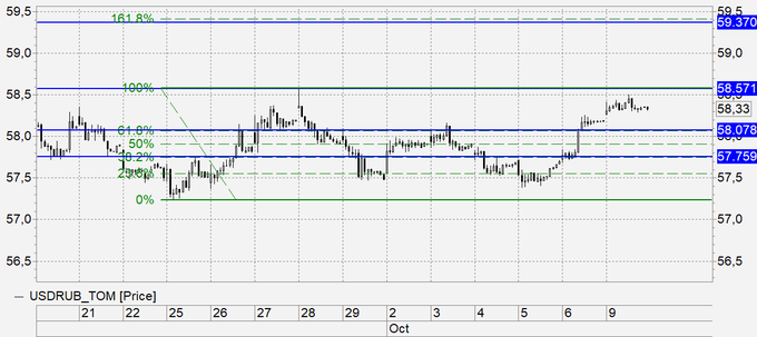 Наиболее вероятно: откат к 58.08 и затем продолжение роста. Менее вероятен, но возможен ход к 57.75. Будем рассчитывать на высокий спрос на доллары. Ход к 57.75 также возможен. Проход ниже 57.75 создаст предпосылки для укрепления рубля вплоть до 55.00.