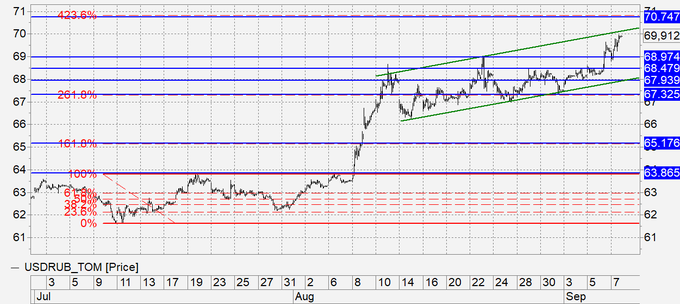 Продажа: возможна при касании 70.70. Стоп: 70.90. Цель: 69.00 (68.00).