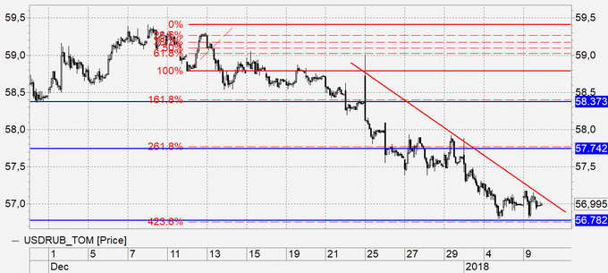 Рубль: нефть радует. Если рост черного золота продолжится, то поддержка на 56.75 может не выдержать, и мы отправимся на 55.00. Вверх начнем смотреть только после роста рыка выше 57.40.