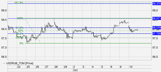 Рубль: рубль вчера окреп. С начала сессии график дернулся вниз, да так и остался под отметкой 58.00, едва приподнявшись от минимумов. Рынок пока выбирает стабильность и легкие метания в диапазоне, однако напряженность сохраняется. Если бы не черный фон в виде ослабления национальной валюты до 80 рублей за доллар двумя годами ранее, мы бы уже давно увидели бы 55.00. А так, уже сейчас рубль выглядит перекупленным.