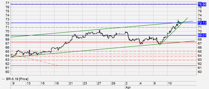 Нефть: напряженность вокруг Сирии продолжает сохраняться. Если атаки со стороны США не последует, то через некоторое время рынок вспомнит о росте добычи в США, которая достигла уже 10.5 млн. баррелей в день. А этот показатель не так давно аналитики ждали только к концу года. Структурно мы должны дойти до 76.00. Рост выше не виден. Небольшая коррекция от 72.00 возможна к 70.00, чем можно воспользоваться для покупок.