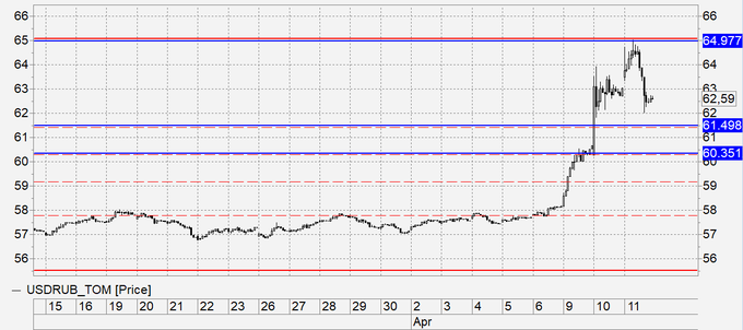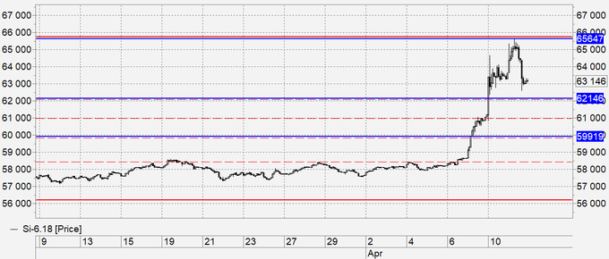 Рубль: благодаря министру финансов США Мнучину, который прямо заявил, что ограничения по работе с государственным долгом РФ ни к чему хорошему не приведут и будут вредны самой Америке, рубль с 65.00 окреп до 62.00. Для хорошего входа в лонг неплохо бы было увидеть рост рубля к 60.00. От этой отметки можно покупать доллары. Не исключено, что сегодня такой ход, а скорее касание, мы и увидим. Самое интересное, если США будут бомбить Сирию – доллар упадет, к корзине валют, так как опять рост военных расходов. Если не будут — тоже. Какой же ты хозяин мира, если ты сдаешь назад. Верно? Следим за новостями. Все может перевернуться с ног на голову за одну минуту.