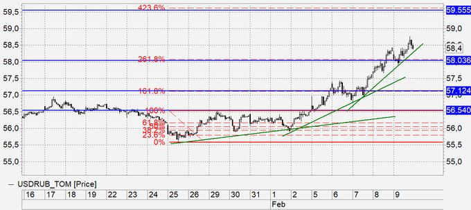 Наиболее вероятно: откат к 57.50 (57.20) и продолжение роста.