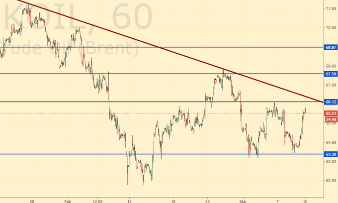 Продажа: сейчас, далее 66.20. Стоп: 66.40. Цель: 56.00. Боюсь, если вновь уйдем выше 66.00 можем пойти выше. Почему? Потому, что этого мало кто ждет. Но фундамент говорит нам о том, что цены все же должны упасть.