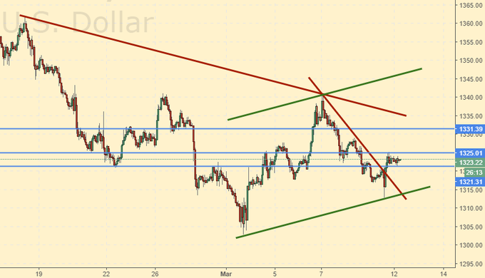 Золото: продолжается уничтожение разума аналитиков в районе 1325. Дело затянулось. Пока ни у одной из сторон нет существенного преимущества. Ценовые рывки можно трактовать и как импульсы, и как коррекции. Поэтому сегодня ограничимся лишь тем, что, если вы уже в позиции и стоп-ордер на сработал, просто стойте.
