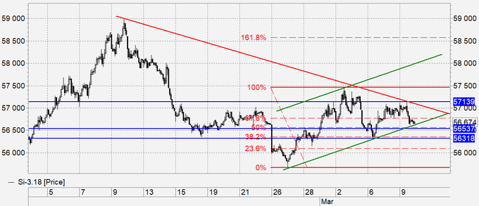 Продажа: после роста к 56800 искать сигналы разворота. Стоп в районе 56900. Цель: 50000.