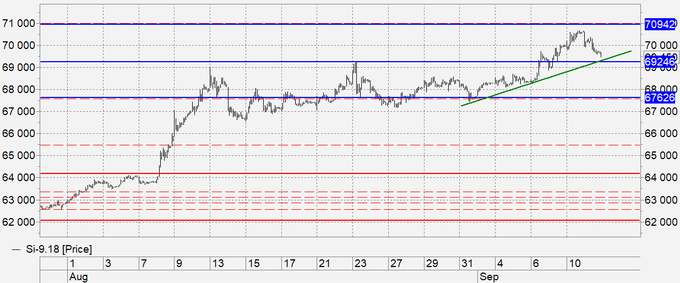 Продажа: возможна при касании 70700. Стоп: 70900. Цель: 69000 (68000).