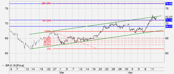 Нефть: к сожалению, вчера лишь показалось, что ситуация вокруг Сирии может стать спокойнее. Пока нефть держится над 71.00 и не исключено, что мы так и не увидим 70.00. Впереди выходные, что подразумевает неопределенность. В течение дня мы не ждем падения цен, разве только Трамп не развернет свой флот на 180 градусов. В любом случае, оставлять открытыми позиции на выходные (шорты в большей степени) вряд ли разумно. Цель прежняя, 76.66.