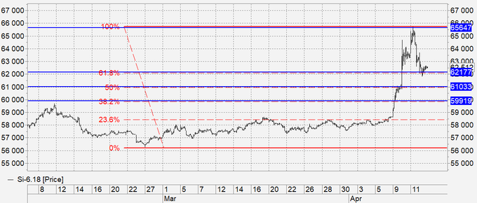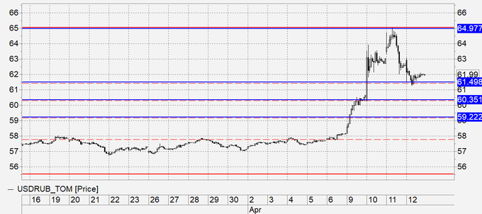 Рубль: очень бы многим хотелось, чтобы доллар упал до 60.00, но пока Сирия на повестке дня, мы не можем ожидать перед выходными значительного укрепления национальной валюты. Если чудо все же произойдет, и мы сегодня коснемся 60.00, купите доллары. Разрастание конфликта в Сирии потребует дополнительного финансирования, хотя, если учесть, что вместе с конфликтом будут расти и цены на нефть… то… так кому все это выгодно? Будет очень интересно, если флот по морю поездит, Трамп покричит, нефть окажется на 76.00 вместо того, чтобы быть на 55.00 и более ничего глобального не произойдет. У нас уже реально сходится бюджет и даже появляются лишние деньги. Бочка нефти сейчас стоит не 2800, как это было относительно недавно, а 4200.