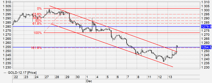 Золото: на фоне ожидаемого повышения ставки ФРС, которое произошло вчера вечером, золото восстановилось до 1257, вышло из падающего канала вверх, сделав будущее данного актива вновь туманным. Сегодня не стоит агрессивно торговать, так как ситуация выглядит смешанной без преимущества какой-либо из сторон.