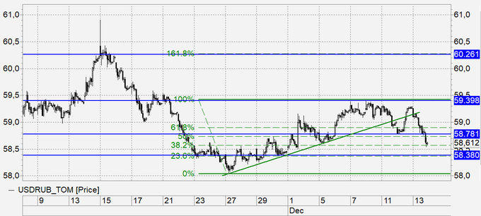 Рубль: продолжаются сердечные метания в пятидесяти копейках. Построившаяся структура выглядит весьма соблазнительно для покупки доллар против рубля, но все же лучше подождать пока мы снова будем выше 59.30, так как в результате вчерашнего роста ставок в США мы пока наблюдаем как минимум тактическое ослабление доллара, так как решение ФРС совпало с ожиданиями участников рынка.