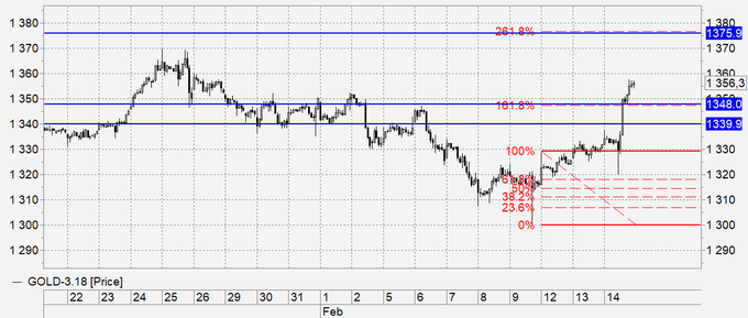 Золото: как интересно. Мы пробили 1340 и пошли вверх.  Вновь ожили наши цели на 1380. Характер роста таков, что мы можем предположить и куда более резвый рост стоимости золота. Поэтому, если вы купили, не спешите продавать на 1380.