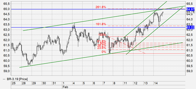 Нефть: рынок поднялся выше 64.00 создав угрозу хода к 70.00. Сегодня вечером выйдут данные по количеству действующих буровых, если показатель вырастет менее чем на 10 единиц рост цен скорее всего продолжится. Можно сказать, что трейдеры оценили по достоинству обещание Саудовской Аравии убрать с рынка в марте 700 тыс. баррелей. Приход весны приведет к росту политической активности в Вашингтоне. Ирану и Венесуэле достанется. Пока в этих государствах падение добычи и, как следствие, сокращающееся предложение на внешнем рынке.