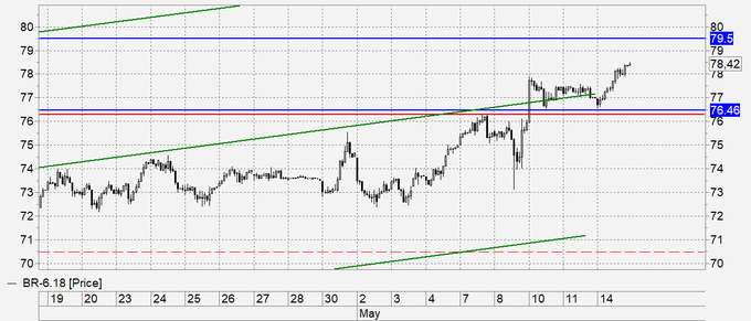 Нефть: продолжается укрепление российского бюджета на фоне массовой гибели палестинцев. Реакция на события в секторе Газа еще последует. Вчера вышел отчет ОПЕК в котором прогнозируется увеличение спроса на нефть к четвертому кварталу 2018 года до 100.28 млн. баррелей в день, в то время как сейчас спрос составляет 98.08 баррелей в день. Учитывая неопределенность с Ираном и возможность пролонгирования сделки по контролю за добычей трейдеры решили еще немного поднять рынок вверх. Тем не менее, пока на рост выше 79.50 мы смотрим скептически.